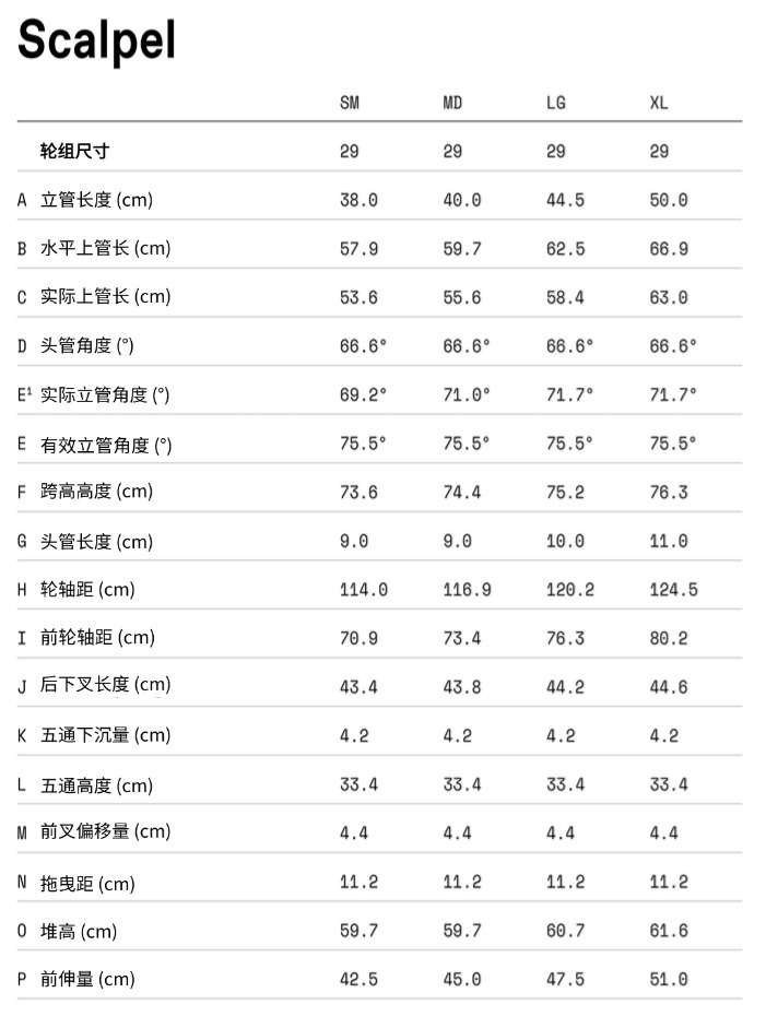 车架 Scalpel,轻量化碳纤维结构,120毫米行程,比例响应悬挂系统与几何结构,FlexPivot后叉,全内走线,73毫米BSA中轴,带1-1/8英寸上部减速器/内部导线导向件的1.5英寸头管,148×12毫米贯通轴,55毫米链条线,UDH通用后拨挂钩,柱装式碟刹,原生适配160毫米刹车盘